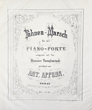 Abbildung 2: Titel des im Hanauer Selbstverlag erschienenen und vom ebenfalls ortsansässigen Lithographen Andreas Wenzel hergestellten Fahnen-Marschs von Anton Appunn; D-OF