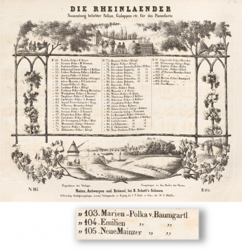 Werke — Sämtlich bei Schott in Mainz erschienen; neben den gedruckten Klavierfassungen vertrieb bzw. verlieh der Verlag handschriftliches Orchestermaterial – (BBS = Baden-Baden-Saison. Beliebte Tänze des Cur-Orchesters): Clara-Walzer op. 1 [1845]; D-B, D-Mbs (digital) <> Emilien-Polka op. 2 (= Die Rheinländer Nr. 104 [1845]; D-Mbs (digital) <> Neue Mainzer Polka op. 3 (= Die Rheinländer Nr. 105); D-Mbs (s. Abb.) <> Marien-Polka op. 4 (= Die Rheinländer Nr. 103); A-ST (Ms.), D-Mbs (digital) <> Jeanetten-Polka op. 5 (= BBS Nr. 1) <> Stolipine-Walzer op. 6 (= BBS Nr. 2) [1848]; D-B, D-Mbs (digital) <> Aurora-Galopp op. 7 (= BBS Nr. 3) [1848] <> Marie-Conyngham-Galopp op. 8 (= BBS Nr. 4) [1848]; D-B <> Dolguruki-Polka op. 9 (= BBS Nr. 5) [1848]; D-B <> Böhmens Constitution. Jubel Polka op. 10 [1850]; D-B, D-Mbs (digital) <> Der lustige Böhme. Polka op. 11 [1850]; D-B, D-Mbs (digital) <> Bianca-Walzer op. 12 (= BBS Nr. 9) [1851]; D-B, D-Mbs (digital) <> Souvenir de Bade. Polka op. 13 (= BBS Nr. 10) [1851]; D-B, D-Mbs (digital) <> Malet-Polka op. 14 (= BBS Nr. 11) [1851]; D-B, D-Mbs (digital) <> Deutsche Michel-Polka op. 15 (= BBS Nr. 6) [1850]; D-B, D-Mbs (digital) <> Barricaden-Galopp op. 16 (= BBS Nr. 7) [1850]; D-B, D-Mbs (digital) <> Olga-Polka op. 17 (= BBS Nr. 8) [1850]; D-B, D-KNh (Ms.), D-Mbs (digital) <> Krieger-Galopp op. 18 (= BBS Nr. 13) [1850]; D-B <> Erholungs-Polka op. 19 (= BBS Nr. 14) [1850]; D-B <> Odeon-Galopp op. 20 (= BBS Nr. 15) [1850]; D-B <> Californier-Galopp op. 21 (= BBS Nr. 16) [1850]; D-B <> Erzgebirger Polka op. 22 (= BBS Nr. 12) [1850]; D-B <> Preussen-Walzer op. 29 (= BBS Nr. 17) [1851]; D-B, D-Mbs (digital) <> ungedruckt: Creuznacher Mutterlauge Galopp, CH-BEl (Ms.) <> Ebernburger Galopp, CH-BEl (Ms.) <> verschollen: Oesterreichischer Sieges Marsch op. 24 und Preussischer Sieges Marsch op. 25; Schott angeboten am 1. Nov. 1850 <> Concert Potpourri (Klar., wohl mit Orch.-Begl.); Schott angeboten am 14. Okt. 1851