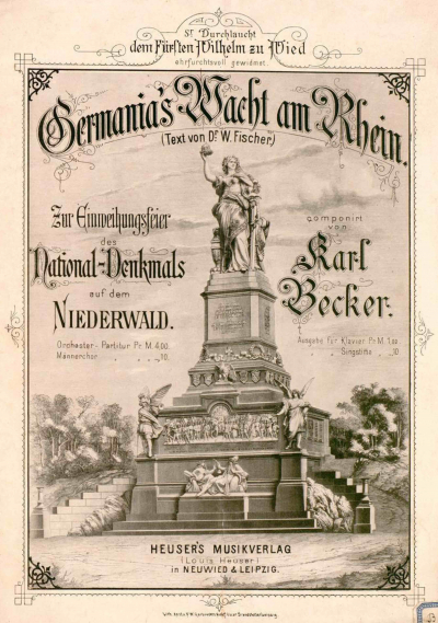 Germania’s Wacht am Rhein. Zur Einweihungsfeier des National-Denkmals auf dem Niederwald, dem Fürsten Wilhelm zu Wied gewidmet, (Orch. bzw. Mch. und Orch.), Neuwied: Heuser [1883]; ehem. D-B, D-Cl, D-KA (digital, s. Abb. 2) – dass. (Kl. bzw. Sst. und Kl.), ebd. [1883] <> Kaiser Wilhelm I. und II. [?] (Mch., Orch.), ebd. [1885] <> Hochwaldlied, ebd. [1891] <> Hoch soll’n sie leben. Toast, Berlin: Benjamin [1893] <> Mädchen mit den blauen Augen (Mch.), Berlin: Hansa-Verlag [1919] <> Ahasver. Ungarisches Albumblatt (Kl.), Neuwied: Heuser <> An meine Heimat (Mch.), ebd. <> Das deutsche Reich (2st. Gsg., Orch.), ebd. <> Flieder und Rosen, ebd. <> In der Heimat (4st. Mch.), ebd. <> Märkische Hymne <> O Welt, wie bist du wunderschön, Selbstverlag <> Westerwaldlied (2st. Gsg., Kl.), Neuwied: Heuser <>