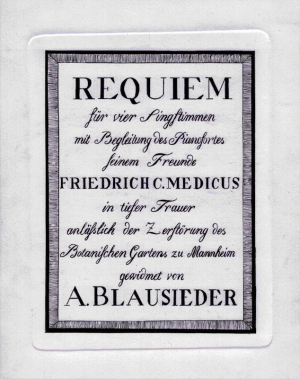 Werke — Liedersammlung Hortulus cantandi, Hs. vermutlich verbrannt – Auswahl veröffentlicht als: Lieder von meiner Lieblingsdichterin (Sst., Kl.), Leipzig: Schmalfuß & Weichel (in Komm.) [1802]; RISM A/I BB 2849a <> Streichquartett ges-Moll op. 1, Paris: Personne, [ca. 1784] (vergriffen) <> Requiem […] seinem Freunde Friedrich C. Medicus in tiefer Trauer anläßlich der Zerstörung des Botanischen Gartens zu Mannheim gewidmet h-Moll (4 Sst., Kl.) op. 13, s. l.: s. n. [um 1795]; RISM A/I B 2849 (s. Abb.) <> Sonate (Kl.), Johann Heinrich Bäumert, dem Stiftsbotaniker des Senckenbergischen Instituts in Frankfurt, gewidmet; verschollen (womöglich kompostiert) <> Mailied (Sst., Kl./Org.) op. 16 [1790]; Ms. vermutlich verschollen