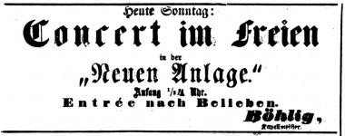 Die Mainzer Musikfreundinnen und Musikfreunde werden am 10. März 1860 mit Freude und Erleichterung dem Mainzer Anzeiger entnommen haben, dass die „Sonntagskonzerte in den reizenden Lokalitäten der neuen Anlage“ nach dem Weggang von Kapellmeister Albert Parlow mitsamt seinem Musikkorps des 34. Infanterie-Regiments, die bis dahin „ungewöhnlich große Anziehungskraft“ ausgeübt hatten, „keine Unterbrechung erleiden“ würden: Ersatz bot fortan die Kapelle des königlich preußischen (schlesischen) 38. Infanterie-Regiments unter ihrem Musikmeister Wilhelm Böhlig, „dem bereits ein sehr vortheilhafter Ruf auf dem Gebiet der Komposition“ vorausgegangen war; im Blick auf die Konzerte (darunter auch, wie zuvor bereits bei Parlow, solche „à la Strauss“) sprach die Presse von „einem hohen Grade künstlerischer Vollendung“ (Mainzer Anzeiger 12. Jan. 1861). Jedoch wurde das Regiment bereits im Sommer 1861 nach Schlesien abkommandiert; seinen Lebensabend verbrachte Böhlig, über den wir – außer, dass er Sohn eines Schneidermeisters war – ansonsten bisher kaum etwas wissen, in Dresden. In Mainz übernahm Ernst Teschner ab Herbst 1861 mit seiner Regimentsmusik die beliebte Konzertreihe in der Neuen Anlage.