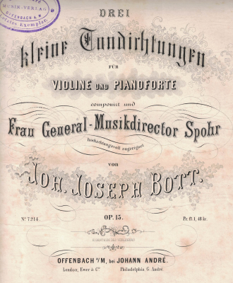 Werke — Opern: Der Unbekannte (Libretto: Eduard Biberhofer; UA Kassel 1854) <> Actäa, das Mädchen von Korinth (Libretto: Julius von Rodenberg; UA Berlin 1862); D-B, D-Ksp – daraus: Schlummerlied und Ballettmusik (Kl.) op. 35, Magdeburg: Haushahn [1879]; D-B – Schlummerlied (Vl., Kl.), ebd. [1882] <> Chor: Sechs Lieder für Männerchor op. 27, Kassel: Scheel [1863]; D-Ksp <> Sechs Gedichte für Männerchor op. 32, Hannover: Simon [1877] <> Der 57. Psalm; D-MEIr (Ms.) <> Lieder: 6 Lieder (T o. S, Kl) op. 8, Kassel: Luckhardt [1851]; D-B <> 2 Lieder (S, Kl.) op. 12, in: Omnibus für Gesang. Auswahl ein- und zweistimmiger Gesänge mit Pianofortebegleitung Jg. 4, Hamburg: Schuberth [1850]; GB-Lbl <> 3 Lieder op. 17, Kassel: Luckhardt [1856]; D-B <> 3 Lieder op. 20, ebd. [1858]; D-B <> Drei Gesänge (Alt o. Bass, Kl.) op. 29, Leipzig: Schuberth [1863]; D-B, D-Ksp <> Venezianische Serenade (Sst. Kl.) op. 44, Hamburg: Cranz [1885] <> Drei Lieder (Sst., Kl.) op. 45, Leipzig: Schuberth [1888]; D-B <> „Die Monduhr“, „Der Schiffer“ und „Die Weinende“ (Sst., Kl.) in: Liederkranz, Kassel: Luckhardt 1849 <> Das Röslein (1841), D-Ksp (Autogr.) <> Der fromme Hirt (1841), D-Ksp (Autogr.) <> Orchester: Konzert-Ouvertüre op. 7; D-Ksp (Autogr.) <> 2te Ouverture (1843); D-Ksp (Autogr.) <> Ouvertüre (1848) (s. AmZ 14. Juni 1848) <> Sinfonie Nr. 1 (1850) (s. NZfM 14. Juni 1850) <> Sinfonie Nr. 2 (1870) (s. NZfM 8. und 22. Apr. 1870, wohl identisch der in mit NZfM 25. Apr. 1873 genannten; Incipit im Gästebuch des Liederkranz in Frankfurt am Main 26. Jan. 1871, Faks. in Kienzle, S. 82) <> Violine und Orchester (auch mit alternativer Kl.-Begl.): Erstes Concertino op. 2 (Spohr gewidmet), Hamburg: Schuberth [1847]; D-B, D-Gs, D-Ksp <> Bravour-Variationen über ein Thema von Bellini op. 4, ebd. [1847]; D-B, D-Gs, D-Ksp <> Adagio religioso op. 6, ebd. [1847]; D-B, D-Dl, D-Gs, D-Ksp, D-Rp, D-Tu <> Andante cantabile op. 9, Kassel: Luckhardt [1847]; D-B <> Romanze op. 13, ebd. [1851]; D-B <> La Polka. Caprice burlesque op. 14, Hamburg: Schuberth [1849]; D-B, D-Gs, D-Ksp, D-SWl <> Variationen über böhmische Volkslieder op. 19, Leipzig: Kistner [1857] <> Concert op. 21, Leipzig: Peters [1860]; D-Gs, D-LEsta (autographe Stichvorlage), GB-Lbl <> Violine und Klavier: Quatre Morceaux de Salon op. 1, Hamburg: Schuberth [1846]; D-Ksp <> Romanesca. Air de Danse du 16ième Siècle, Kassel: Luckhardt [1851]; D-F, D-KA – NA ebd. [1873]; D-Mbs (digital) <> Romanze op. 13, ebd. [1851]; D-B (Ausg. Berlin: Raabe & Plotow) <> Drei kleine Tondichtungen op. 15 („Frau General-Musikdirector Spohr hochachtungsvoll zugeeignet“), Offenbach: André [1852]; D-Gs, D-Ksp, D-OF (s. Abb.) <> Drei Salonstücke op. 18 (seiner Schwester Marie Louise gewidmet), Mainz: Schott [1858]; D-B, D-Gs <> Fantasie über Themen aus der Oper Casilda von Ernst Herzog von Sachsen-Coburg-Gotha op. 22, Kassel: Luckhardt [1858]; D-Cl <> Drei Salonstücke op. 23, Leipzig: Breitkopf & Härtel [1859]; D-Gs, GB-Lbl <> Andante op. 24 („seinem Bruder Carl zugeeignet“), Leipzig: Peters [1859]; D-Gs, GB-Lbl <> Drei Stücke op. 25, Breslau: Leuckart [1860]; D-B, D-Gs, D-Rp <> Drei Tondichtungen op. 28, Leipzig: Schuberth [1864]; D-B, D-Gs <> Andante und Capriccio op. 30, Hannover: Nagel [1864]; D-Ksp <> 3 Lieder ohne Worte op. 36, Magdeburg: Rathke [1880]; D-Bim <> Wiegenlied op. 37, Hannover: Simon <> Maiabend-Fantasie. Lied ohne Worte op. 38, Berlin: Schlesinger [1883]; D-B, D-Gs <> Winzerfest. Lied ohne Worte op. 40, Leipzig: Schuberth [1888]; D-B <> Cavatine op. 41 (Joseph Joachim gewidmet), Hamburg: Leichsenring [1885]; D-B, D-Gs, D-Hs (digital), GB-Lbl <> Indian Cradle Song op. 46, Leipzig: Schuberth [1888] <> Idylle op. 51 (auch mit Ob. statt Vl.), Hannover: Lehne; D-B <> Three characteristic pieces op. 52, Chicago: Chicago Music <> Klavier: Zwei Lieder ohne Worte op. 3, Leipzig: Schuberth [1862] <> Etüde a-Moll op. 5, ebd. [1860] <> Impromptu brillant op. 7, ebd. [1862] <> Drei kleine Salonstücke op. 11, ebd. [1862] <> Drei Stücke op. 34, Bielefeld: Sulzer [1879] <> Hessischer Zapfenstreich-Galop und Wehmuthsklänge Polka, in: Tanzalbum, Kassel: Luckhardt [1851] <> Weihnachts-Polka, in: Neue Sammlung beliebter Tänze und Märsche, ebd. [1856] <> Sechs Etudes (1843); D-Ksp (Autogr.)