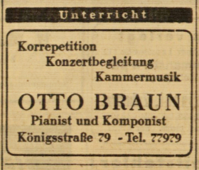 BRAUN, OTTO (FRIEDRICH) * Biebrich 13. Apr. 1900 | † Frankfurt/M. 15. Dez. 1980; Pianist und Komponist