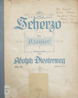 (2) Gesicherte Nachrichten über die musikalische Ausbildung Moritz Diesterwegs fehlen bislang; als jüngster Teilnehmer war er 1880 (neben Georg Goltermann, Heinrich Henkel, Joseph Joachim Raff – diese drei mögen seine Lehrer gewesen sein –, Gotthold Kunkel, Siegfried Ochs, Emil Sulzbach u. a.) beim ersten Frankfurter Komponistenabend mit von der Partie. Vermutlich setzte Diesterweg seine Ausbildung am Berliner Scharwenka-Konservatorium fort und fand dort eine Anstellung als Lehrer. Im Oktober 1886 gründete er das Braunschweiger Konservatorium, dem er bis etwa 1895 vorstand, bevor er sich in Berlin niederließ und eine Akademie für höheres Klavierspiel, Violine und Gesang ins Leben rief, die von etwa 1904 an als Diesterweg-Akademie bekannt war. Seit derselben Zeit begegnet Diesterweg auch als Musikschriftsteller in den Adressbüchern, die ihn 1914 nicht mehr als Leiter der Akademie (nur noch als Tonkünstler) führen. Wenig später verließ er Berlin; ob bereits in Richtung Königstein, weiß man nicht.