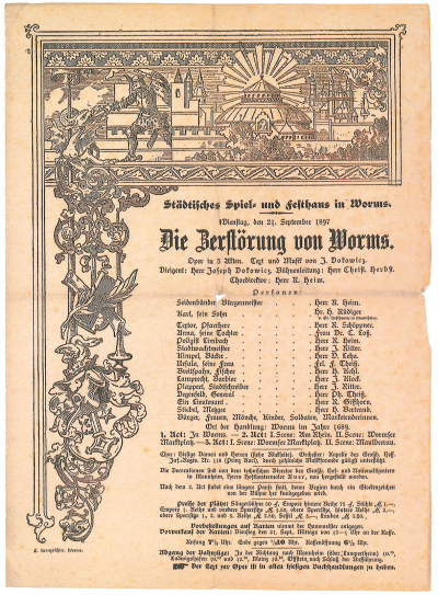 Das zweifellos spektakulärste Ereignis im Leben des Musikers Dokowicz war die überregional wahrgenommene Aufführung seiner Oper Die Zerstörung von Worms (auf eigenen Text) am 21. Sept. 1897 (mit Wiederholungen am 24. und 30. Sept.) im Städtischen Spiel- und Festhaus unter Leitung des Komponisten und unter Mitwirkung von „80 Dilettanten aus der Wormser Bürgerschaft“ (Anzeige in Wormser Tageblatt 20. Sept. 1897 u. ö.); nach Auffassung des Rezensenten zeigte sich, „was Dilettanten mit ihren bescheidenen Kräften, wenn sie verständnißvoll geleitet und unterwiesen sind, in hingebungsvollem, ernstem Zusammenwirken zu leisten vermögen“ (Wormser Tageblatt 22. Sept. 1897). Bereits im September 1893 hatte Dokowicz mit Ignaz Brülls Das goldene Kreuz den Versuch einer „im Wesentlichen mit Wormser Musikkräften“ zu realisierenden Opernaufführung unternommen; der öffentliche Wunsch an die Beteiligten, „sich durch nichts abhalten [zu] lassen, den nun einmal betretenen Weg weiter zu gehen“ (Wormser Tageblatt 26. Sept. 1893), war sicherlich der Ausgangspunkt für die vier Jahre später umgesetzte Idee.