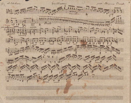 Werke — (als E[tienne] Dunst) Caprice (Git.) op. 5 (Widmung an Legnani), Mainz: Schott [1825/26]; D-Mbs, verm. autogr. Stichvorlage ebd. (digital, s. Abb.) <> 3 Oesterreichische Favorit Ländler mit Coda, Wien: Eder [1823] <> Vokal-Terzett, ebd. [1823] <> Erinnerung (Sst., Kl.), in: Musikalisches Wochenblatt, Wien: Paterno (angekündigt in der Wiener Zeitung 19. Jan. 1836) <> 4 Variationen (Git.), lt. Wiener Theaterzeitung 18. Juli 1822 von Dunst komponiert und in Graz aufgeführt; ungedruckt, verschollen <> Variationen auf der G-Saite (1833); ungedruckt, verschollen (s. Bereths, S. 95)