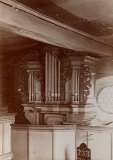 Abbildung 1: Die Orgel von Johann Ludwig Eichhorn in der ev. Kirche von Hüttenberg-Hochelheim (Foto vor 1906); Archiv der Kirchengemeinde
