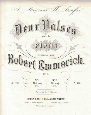 Abbildung: Titel der seinem Lehrer Theodor Stauffer gewidmeten Deux Valses (Kl.) op. 3, Offenbach: André [1856]; D-OF
