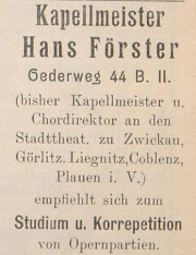 FÖRSTER, JOHANNES (gen. Hans) * Neustrelitz 27. Okt. 1878 | † verm. Frankfurt/M. nicht vor 1943; Kapellmeister und Musiklehrer