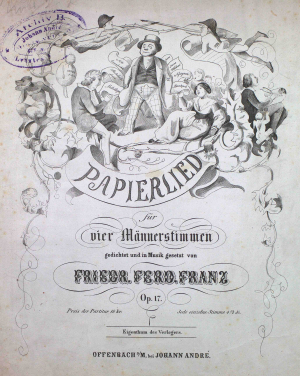 Der Pfarrerssohn Friedrich Ferdinand Franz verkörpert eine der ungewöhnlichsten und kuriosesten Facetten des mittelrheinischen Musiklebens im 19. Jahrhundert. Von 1846 bis kurz vor seinem Tod ist er als Vertreter der Papierfabrik J. Krauß Erben in Pfullingen in der Region nachweisbar und unternahm von Frankfurt aus, wo er bei einer Metzgerswitwe logierte, Geschäftsreisen nach Neuwied, Bacharach und Kreuznach, weiterhin nach Köln, ins Westfälische, nach Hamburg und zuletzt nach Düsseldorf. Die Kosten für die Herstellung seiner musikalischen Werke (hierbei stammt der reizvolle Text seines Papierlieds auch aus seiner Feder), die er akribisch überwachte und für die er auch das Papier und die Vorlagen für die aufwendige Gestaltung der Titel lieferte, übernahm er in vollem Umfang selbst und verteilte die Exemplare, nachdem er zuvor auch für Anzeigen und Rezensionen in der Presse gesorgt hatte, ganz offensichtlich als persönliche Visitenkarten bzw. Firmenpräsente. Mit seinem Männerchor Die Weinprobe beteiligte er sich 1845 an einem Kompositionswettbewerb anlässlich eines Sängerfests der Liedertafeln von Koblenz und Trier in Trarbach, war aber, trotz offensichtlicher Anerkennung durch die Preisrichter Heinrich Marschner, Carl Gottlieb Reissiger und Franz Lachner, nicht so glücklich, den von der Trarbacher Casinogesellschaft ausgelobten ersten Preis, ein Fuder Moselwein, erringen zu können. Es ist sehr wahrscheinlich, dass Franz sich auf dem Titel seines Papierlieds in Form einer Selbstkarikatur verewigte.