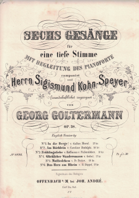 Werke (Unter besonderer Berücksichtigung der seit 1854 in der Region erschienenen; die meisten Werke für Vc. und Orch./Kl. kamen auch in unterschiedlichen Bearbeitungen heraus. Die Datierungen beziehen sich auf die frühesten der oft zahlreichen Auflagen) — 1. Concert (Vc., Orch.) op. 14, Leipzig: Breitkopf & Härtel [1852]; D-Mbs (digital) <> Romance (Vc., Orch.) op. 17, Offenbach: André [1854]; D-B, D-OF <> Symphonie op. 20, Leipzig: Breitkopf & Härtel [1852]; D-B, GB-Eu <> 6 Gesänge op. 21, Offenbach: André [1854]; D-B, D-OF <> Romance (Vc., Orch.) op. 22, ebd. [1855]; D-B, D-OF <> 6 Gesänge op. 23, ebd. [1856]; D-B, D-OF <> Capriccio (Vc., Orch.) op. 24, Hannover: Nagel [1856]; D-Mbs (digital) <> Grand Duo en Forme d’un Sonate (Vc., Kl.) op. 25, Leipzig: Peters [1857]; D-B, D-KNh, D-Mbs <> Vier Lieder op. 26, Offenbach: André [1856]; D-B, D-Kbeer, D-OF <> Frühlingslied (Sst., Kl., Vl.) op. 27, Frankfurt: Henkel [?]; ehemals D-B <> 4 Lieder op. 28, Frankfurt: Henkel [1859]; D-B <> Lied Schönster Wunsch (m. Kl. u. Vc.) op. 29, Offenbach: André [1859]; D-B, D-OF <> 2. Concert (Vc., Orch.) op. 30 (Widmung an Robert Emil Bockmühl), ebd. [1860]; D-B, D-OF <> Zwei Balladen op. 31, ebd. [1859]; D-B, D-OF <> Sechs Gesänge op. 32, ebd. [1860]; D-B, D-Kbeer, D-OF <> Die Worte des Glaubens (SATB, Kl.) op. 33, Frankfurt: Henkel [1861] <> Sechs Gesänge op. 34, Offenbach: André [1861]; D-B, D-OF <> Quatre Morceaux de Salon (Vc., Kl.) op. 35 (Widmung an Wilhelm von Erlanger), ebd. [1862]; A-Wn, D-B, D-OF <> 1. Sonatine (Vc., Kl.) op. 36, ebd. [1862]; D-OF <> Ouverture zu Waldmeisters Brautfahrt (Orch.) op. 37, Leipzig: Siegel [1862]; D-Mbs (digital) <> Sechs Gesänge op. 38, Offenbach: André [1863]; D-B, D-Kbeer (s. Abb. 2), D-OF <> Drei Gesänge op. 39, ebd. [1863]; D-B, D-OF <> Lied Die Thräne des Herzens op. 40, Mainz: Schott [1863]; D-B <> 3 Morceaux caractéristiques (Vc., Kl.) op. 41, ebd. [1863]; D-B, D-Mbs (digital) <> Danses allemandes (Vc., Kl.), Heft 1, op. 42, ebd. [1864]; D-B, D-Hu, D-Mbs, DK-Kk – dass. (Eduard Föckerer gewidmet; Va., Kl.) als op. 42bis, ebd. [1864]; PL-Ep (nur Va., digital) <> Quatre Morceaux caractéristiques (Vc., Kl.) op. 43, Offenbach: André [1864]; D-B, D-OF <> Vier zweistimmige Gesänge op. 44, ebd. [1864]; D-B, D-OF <> Fünf Lieder op. 45, ebd. [1865]; D-B, D-OF <> 4 Lieder op. 46, Mainz: Schott [1865]; D-B <> Danses allemandes (Vc., Kl.), Heft 2, op. 47, ebd. [1865]; D-B, DK-Kk <> Quatre Morceaux caractéristiques (Vc., Kl.) op. 48, ebd. [1866]; B-Ac, D-B, D-BMs (Nr. 4) <> Vier Soli (Vc., Kl.) op. 49, Offenbach: André [1866]; D-B, D-OF <> Lied Inmitten von Blüthen op. 50, Mainz: Schott [1867]; D-B, GB-Lbl <> 3. Concert (Vc., Orch.) op. 51, Offenbach: André [1868]; D-B, D-OF <> Romances sans Paroles (Vc., Kl.) op. 52, ebd. [1868]; D-B, D-OF <> Quatre Morceaux caractéristiques (Vc., Kl.) op. 53, Mainz: Schott [1868]; D-B, D-Hu <> Quatre Morceaux caractéristiques (Vc., Kl.) op. 54, Offenbach: André [1869]; D-B, D-OF <> Lied Aus dem Liebesfrühling op. 55, Mainz: Schott [1869]; B-Ac, D-B <> Andante religioso (Vc./Va., Kl.) op. 56, Offenbach: André [1869]; D-B, D-OF, PL-Ep (nur Va., digital) <> Lied Nun klinge, mein Lied (m. Kl. u. Vc.) op. 57, ebd. [1869]; D-B, D-OF <> Lied Aufgeblüht (m. Kl. u. Vc.) op. 58, ebd. [1869]; D-B, D-OF <> Notturno et Saltarello (Vc., Kl.) op. 59, ebd. [1869]; D-B, D-OF <> Romance et Tarantelle (Vc., Kl.) op. 60, ebd. [1869]; D-B, D-OF <> 2. Sonatine (Vl./Va./Vc., Kl.) op. 61, ebd. [1870]; D-B, D-OF, PL-Ep (nur Va., digital) <> Six Morceaux caractéristiques (Vc., Kl.) op. 62, ebd. [1871]; D-B, D-OF <> 15 Préludes faciles (Orgel), Heft 1, op. 63, ebd. [1871]; D-B, D-OF <> 15 Préludes faciles (Orgel), Heft 2, op. 64, ebd. [1871]; D-B, D-OF <> 4. Concert (Konzertstück; Vc., Orch.) op. 65, Offenbach: André [1871]; D-B, D-OF <> Fantaisie (Vc., Kl.; über Motive aus Webers Oberon) op. 66, ebd. [1872]; D-B (digital) <> Drei Lieder op. 68, ebd. [1872]; D-B, D-OF <> Lied Mein Vaterland op. 69 (Widmung an Kaiser Wilhelm I.), ebd. [1872]; D-B, D-Kbeer, D-OF <> Lied Rheinfarth (m. Kl. u. Vc.) op. 70, ebd. [1872]; D-B, D-OF <> Lied Gruss an Königstein op. 71, ebd. [1872]; D-B, D-OF <> 15 Morceaux petits et faciles (Orgel) op. 72, ebd. [1872]; D-B, D-OF <> Marche héroique (Kl. 4ms, Vl., Orgue-Mélodium) op. 73, Mainz: Schott [1872]; A-Wn, D-B <> Lied Perle des Jahres op. 74, Offenbach: André [1873]; D-B, D-OF <> Lied Frühlingswonne op. 75, Mainz: Schott [1873]; D-B, US-COS <> 5. Concert (Konzertstück; Vc., Orch.) op. 76, Offenbach: André [1874]; D-B, D-OF <> Vier Lieder op. 77, ebd. [1874]; D-B, D-OF <> Vier Lieder op. 78, ebd. [1874]; D-B, D-OF <> Vier Lieder op. 79, Mainz: Schott [1875]; D-B, GB-Lbl <> Lied Liebesbotschaft op. 80, ebd. [1875]; D-B <> Ballade op. 81, Offenbach: André [1876]; D-B, D-OF <> Kinderlied von den grünen Sommervögeln (2st. Fr.- oder Jugendchor m. Kl.) op. 82, ebd. [1876]; D-B, D-OF <> Adagio (Vc., Orch.) op. 83, Mainz: Schott [1877]; D-B, D-Mbs <> Lied Herbstlied (m. Kl. u. Vc.) op. 84, ebd. [1877]; D-B, GB-Lbl <> Vier Lieder op. 85, ebd. [1877]; D-B <> Lied Frühlingsanfang (m. Kl. u. Vc.) op. 86, Offenbach: André [1877]; D-B, D-OF <> Romance. Morceau de Concert (Vc., Orch. o. Kl.) op. 87, Mainz: Schott [1877]; D-B, D-Hu, D-Mbs <> Elégie (Vc., Orch.) op. 88, Offenbach: André [1878]; D-B, D-OF <> 15 Morceaux (Orgel oder Harmonium) op. 89, ebd. [1879]; D-B, D-OF <> 3 Romances sans Paroles (Vc., Kl.) op. 90, Mainz: Schott [1880]; B-Ac, D-B, US-NYp <> Lied Nach Jahren (m. Kl. u. Vc.) op. 91, ebd. [1880]; A-Wn, D-B, D-F <> Trois Morceaux de Salon (Vc., Kl.) op. 92, Offenbach: André [1879]; D-B, D-OF <> Lied Mein Stern (m. Kl. u. Vc.) op. 93, Mainz: Schott [1881]; D-B, GB-Lbl <> Festspiel-Ouverture (Orch.) op. 94, ebd. [1881]; D-B, D-F (digital) <> Trois Romances symboliques (Vc., Kl.) op. 95, Offenba