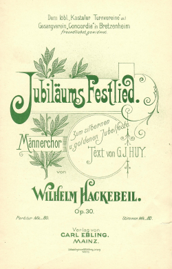 WerkeJubiläums Festlied (Mch.) op. 30 („Dem löbl. ‚Kasteler Turnvereine‘ und Gesangverein ‚Concordia‘ in Bretzenheim freundlichst gewidmet. Zum silbernen u. goldenen Jubelfeste.“), Mainz: Ebling [ca. 1896/1897?]; ehemals D-B, D-BABHkrämer (s. Abb.), D-Hbierwisch, D-MZsch <> Schön’ Rose vom See. Preis-Chor (Mch.) („seinem Männer-Gesangverein ‚Cäcilia‘ in Gonsenheim gelegentlich des 60jährigen Jubelfestes, verbunden mit nat. Gesang-Wettstreite zugeeignet“), ebd. [ca. 1906]; ehemals D-B, D-BABHkrämer, D-Hbierwisch, D-MZsch <> als Arrangeur: Friedrich Silcher, Es ist vollbracht (Mch.), ebd. [ca. 1900]; ehem. D-B, D-BABHkrämer, D-Hbierwisch, D-MZsch <> Volkslied Reiters-Morgengesang (Mch.), ebd. [ca. 1911]; D-BABHkrämer, D-Hbierwisch, D-MZsch
