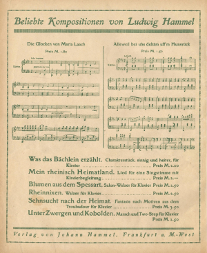 Der Landwirtssohn und Ingenieur Ludwig Hammel trat in den Jahren 1919 bis 1922 mit mehreren Kompositionen (zumeist für Klavier) in Frankfurt/M. an die Öffentlichkeit. Näheres zu seinem musikalischen Werdegang oder weiteren musikalischen Betätigungen ist nicht bekannt. Hammel lässt sich zuerst bei seiner 1908 in Mosel (bei Zwickau) erfolgten Eheschließung mit Ernestine geb. Beck (später geschieden) nachweisen. Möglicherweise hatte er zuvor seine Ausbildung an der Ingenieur-Schule in Zwickau erhalten. Ab 1909 führen ihn die Frankfurter Adressbücher zunächst als Geschäftsführer in der Firma Elektrizitäts-GmbH Hammel & Radloff, aus der er jedoch noch 1909 ausschied, bis 1916 dann als Inhaber eines Techn. Bureau[s] f. elektr. Anlagen, Zentralen, Straßenbahnen u. gleislose Bahnen und seit 1914 als gerichtlichen Sachverständigen für Elektrotechnik und Mechanik und für „Angelegenheiten aus dem Gebiete der elektrischen und maschinellen Anlagen“. Seit 1910 veröffentlichte er Schriften zu seinem Fachgebiet, die sich an ein breites Publikum richteten und in zahlreichen Auflagen erschienen. 1915 eröffnete er die Einzelhandelsfirma Ludwig Hammel, Maschinenfabrik, die 1919 erlosch. 1918 trat er in die im Jahr zuvor gegründete Firma Akademisch-Technischer Verlag Johann Hammel ein, die die Mehrheit seiner Bücher publizieren sollte und bis 1932 bestand. Auch seine Kompositionen erschienen bei einem Verlag Johann Hammel in Frankfurt/M.-West (Verlagsnummern zwischen „J. H. 18“ und 57; Herstellung sowohl bei Brandstetter als auch bei Röder in Leipzig), allerdings ließ sich die Identität Johann Hammels bislang nicht klären. Dass eine Chorfassung von Ludwigs Klavierstück Was das Bächlein erzählt im Verlag Johann Adrio erschien, der sich seit 1923 in seinem Besitz und unter derselben Adresse wie sowohl seine Wohnung als auch Johanns Akademisch-Technischer Verlag befand, bestätigt zumindest die Annahme, dass der Ingenieur wirklich unser Komponist und sein Kompagnon der Verleger ist. Etwas verwunderlich sind die (im Abgleich mit dem Buchhandelsadressbuch) widersprüchlichen Angaben im Handelsregisterteil des Frankfurter Adressbuchs, denen zufolge der Adrio-Verlag noch 1928 Johann Adrio gehörte, 1929 dann nicht mehr als Verlag, sondern als Chemische Fabrik von ihm und Maria Anna Henni[n]g geführt wurde. Zudem ist letztere stets mit ihrem Mädchennamen genannt (bis 1938 Ludwig Hammel statt Adrio an ihre Seite trat), obwohl sie bereits 1930 die zweite Ehefrau Hammels geworden war. Da ein Übergang der Firma Adrio von Johann Adrio auf Ludwig Hammel offiziell bekannt gegeben wurde, erscheint die (sonst naheliegende) Vermutung, der Name „Johann Adrio“ könnte ein Pseudonym sein, als unplausibel.