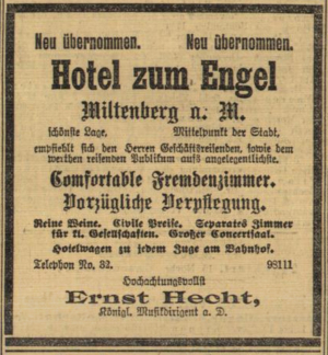 Quellen — KB Seyda (ev.); KB Frankfurt/M. (Militärgemeinde); KB Miltenberg (ev.) <> Standesamtsregister Frankfurt und Nikolasee (Berlin) <> Briefe von Hecht bzw. in seinem Auftrag an André in Offenbach (3, 1900); D-OF <> Adressbücher Frankfurt <> Dienstalters-Liste der Stabshoboisten, Stabstrompeter, Stabshornisten des Deutschen Reichsheeres und der Kaiserlichen Marine, Berlin 1891, S. 18 <> Frankfurter Zeitung und Handelsblatt 26. Sept. 1887 (Abendblatt), 5. Aug. 1889 (Morgenbl.), 25. Juli 1890 (2. Morgenbl.), 14. Juli 1893 (2. Morgenbl.), 3. Aug. 1893 (1. Morgenbl.), 12. Aug. 1893 (2. Morgenbl.), 16. Aug. 1893 (2. Morgenbl.), 13. Mai. 1894 (2. Morgenbl.), 23. Mai 1894 (Abendbl.), 10. Juni 1894 (3. Morgenbl.), 15. Jan. 1896 (2. Morgenbl.), 16. Apr. 1896, 16. Okt. 1897 (Abendbl.), 18. Okt. 1897 (Abendbl.), 19. Okt. 1897 (Abendbl.), 20. Okt. 1897 (Abendbl.), 12. Okt. 1901 (3. Morgenbl.) (Zum Dienstjubiläum), 7. Juli 1902 (Morgenbl.), 16. Nov. 1902 (1. Morgenbl.); Wiesbadener Bade-Blatt 7. Aug. 1890, 22. Juni 1894; Bayerischer Kurier 4. Mai 1892; Frankfurter Latern 14. Mai 1892, 16. Juli 1892; General Anzeiger der Münchner Neuesten Nachrichten 5. Juli 1892; Bamberger Neueste Nachrichten 8. Juli 1892; Wiesbadener General Anzeiger 22. Juni 1894; Die Fackel (Frankfurt/M.) 17. Okt. 1906; Grünstadter Zeitung 29. Okt. 1908, 1. Dez. 1908, 20. Jan. 1909