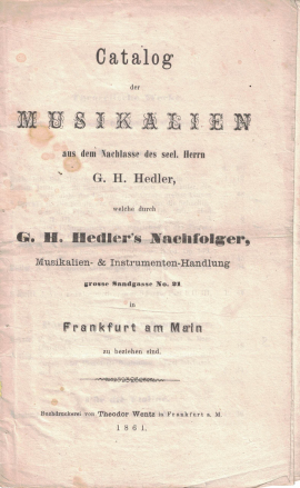 Seit 1795 betrieb der Handelsmann Georg Heinrich Hedler (* Frankfurt 27. Nov. 1756 | † ebd. 16. Febr. 1814) gemeinsam mit Johann Conrad Gayl (* Frankfurt 28. Okt. 1760 | † ebd. 14. Okt. 1842, ebenfalls Handelsmann) unter der Firma Gayl & Hedler eine Musikalienhandlung in Frankfurt, die auf ein von Gayls Vater Johann Jost (seinerseits Weinessigsieder und Hersteller von Kupferdruckerschwärze) 1784 begründetes Unternehmen zurückging. 1811 trennten sich die Partner „in Freundschaft“ (Trennungs-Circular; s. Quellen), nachdem sie einen der wichtigsten kommerziellen Umschlagplätze für Musikalien aus ganz Europa im deutschsprachigen Raum etabliert hatten, blieben aber beide dem Metier treu. Hedlers Sohn (Johann Franz Bernhard) Heinrich (* Frankfurt 21. Juli 1797 | † ebd. 12. August 1860) übernahm nach dem Tod des Vaters dessen Firma (nach wie vor als G. H. Hedler), handelte zudem mit Spielkarten, Visitenbillets und vergleichbaren Luxuswaren und schloss dem Betrieb wohl 1829 einen Musikverlag an, der nach seinem Tod noch bis 1869 weitergeführt wurde (G. H. Hedler’s Nachfolger). Ein Überblick über die Verlagsproduktion (mehr als 600 Musikdrucke in Lithographie) wird dadurch erschwert, dass zum einen Anzeigen bis 1840 fast vollständig fehlen und auch später rar sind, und zum anderen, dass bei einem großen Anteil von in die Nummernfolge integrierter Kommissionsware (von Hedler als solche auf den Titeln klassifiziert) Aussagen über die eigentliche Herkunft bzw. den Sinn der Angabe nur zu einem Teil möglich sind. Das Programm umfasst neben Werken zahlreicher Autoren aus der Region (z. B. Heinrich und August Düring, Louis Ehatt, Friedrich Carl Haueisen, Heinrich Hecht, Wilhelm Lutz, Franz Messer, August Müller, Wigand Oppel, Johann Conrad Quilling, Friedrich Wilhelm Rühl, Johann Andreas Springer), Nachdrucke überregional bekannter Lieblingsstücke, eine Subskriptionsreihe von beliebten Ouvertüren in Bearbeitung für Klavier zu zwei und vier Händen (1830/31), weiterhin eine Reihe Die Mainlust. Auswahl vorzüglich beliebter Tänze (wenigstens 113 Titel 1834 bis ca. 1845; s. die Abb. im Artikel Bachfeld), die auf den gleichnamigen Frankfurter Vergnügungspark mit seiner „gut besetzte[n] Instrumental-Musik“ (Didaskalia 8. Sept. 1832) verweist. Daneben finden sich auch zehn Streichquartette Mozarts (1832; s. Abb.) und Bachsche Präludien und Fugen (beide „nach dem Orginal-Manuscript“) jeweils im Arrangement für Klavier zu vier Händen (VN 221, 1833).