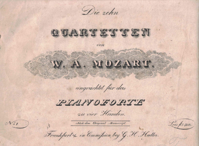 Abbildung 4: Die zehn Quartetten von W. A. Mozart. eingerichtet für das Pianoforte zu vier Händen Nr. 1 (KV 387, bearb. für Kl. 4ms), Frankfurt: Hedler (in Commission), VN 71 [1832]; D-Kbeer