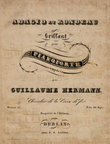 Werke (Auswahl gedruckter Werke; zu weiteren Werken aus Trier siehe Bereths 1978) — Grande Sonate (Kl. mit obl. Vc. od. Vl.) op. 1, Koblenz: Falckenberg [1824] <> Solo pour Pianoforte, contenant Variations et Polonaise op. 2, ebd. [1824]; D-KLu, D-TRs, PL-WRu <> Sechs Lieder von Matthisson (Sst., Kl.; „der Frau Regieruns-Chef Präsidentin Delius hochachtungsvoll gewidmet“) op. 3, ebd. [1824]; D-KBrlb (digital), D-TRs, A-Wgm (EitnerQ) <> 6 Lieder (mit Kl.; Text Carl Streckfuss) op. 36, Berlin: Lischke [1833/34] <> Trinklied von Novalis, in Form einer Polonaise (Kl.) op. 37, Berlin: Lischke [1831]; Berlin: Brandenburg [1833] <> Le bal masqué, danses de carnaval pour 1834 (12 Tanzstücke, Kl.) op. 38, Berlin: Lischke [1833] <> Polonaise nach dem Liede von Fischer: „die Sehnsucht“ (Kl.) op. 39, ebd. [1833] <> Acht Galoppen (Kl.) op. 40, ebd. [1833] <> Sechs Masurca (Kl.) op. 41, ebd. [1833] <> Drei Regdowak mit beliebten Anklängen aus der Oper: Die Montecchi und Capuletti von Bellini op. 42 (Berliner AmZ irrt mit op. 12), ebd. [1833]; PL-WRu <> Gesellschaftslied: „der weisse Hirsch,“ von Uhland (mit Kl.) op. 43, ebd. [1833] <> Drei Rondo-Walzer (Kl.) op. 44, ebd. [1833] <> Adagio et rondeau brillant (Kl.) op. 45, ebd. [1833]; D-Mbs (digital, s. Abb.) <> Six Polonaises (Kl.) op. 46, ebd. [1833/34] <> Sechs Walzer (Kl.) op. 27 (möglicherweise irren AmZ und Berliner mus. Zeitung und meinen op. 47), ebd. [1833] <> Deutsches Bundeslied v. J. N. Firmenich, bei der Gelegenheit der Feier am 8. Septbr. 1841 zu Detmold (Singst. mit Kl.), Köln: Eck [1842] <> Variations brillantes sur un Motif tiré de l’Opéra: Il Crociato de Meyerbeer (Kl.), Mainz: Schott [1843]; D-B