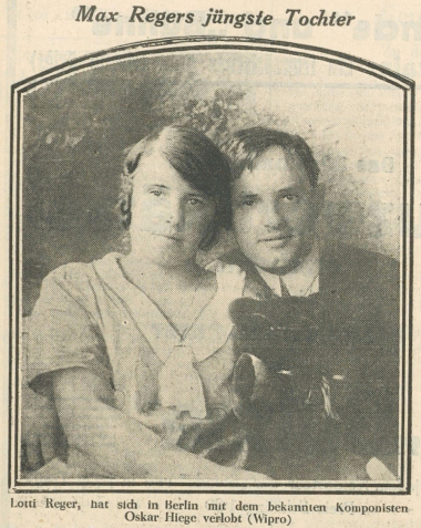 1926 verlobte Hiege sich mit Lotti Reger (* Leipzig 8. Febr. 1907 | † Hamburg 22. Juli 1963, eig. Selma Charlotte Meinig), der jüngeren der beiden Adoptivtöchter Regers, die er sogar als Alleinerbin in einem voreilig aufgesetzten Testament einsetzte. Aufgrund von Unstimmigkeiten – Elsa Reger überging die Eltern Hieges bei der Einladung zur Hochzeit, übernahm eigenständig die Wahl der Ringe und insistierte auf dem Attribut „Adoptivtochter“ für die Braut – kam es jedoch nicht zum Eheschluss. Am Ende standen eine umfangreiche Klageschrift Hieges mit persönlichen Beleidigungen gegen seine Braut sowie eine sich über Jahre hinziehende Kontroverse um den Verbleib von Geld, Geschenken, Briefen u. a. (ausführliche Darstellung bei Popp 2024, S. 22–25). Lotti Reger heiratete im Mai 1929 den Kinderarzt und nachmaligen Prof. in Marburg Joachim Brock (* Berlin 28. Jan. 1891 | † 1969).