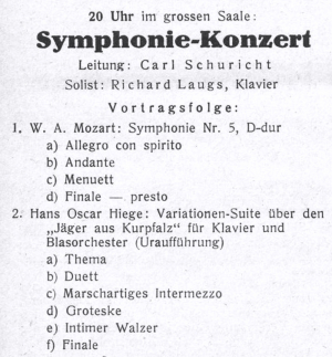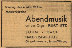 Weniger problematisch waren die nachfolgenden Auftritte, etwa am 11. Jan. 1914, als Hiege als Cellist beim Abonnements-Konzert in der Stadthalle Kronberg zu hören war, oder als er am 25. Jan. 1914 bei einem „Winterfest mit Tanzvergnügen“ in Neuenhain (Gasthof „Zum Nassauer Hof“) den Gesangverein Apollo dirigierte. Nach Ausbruch des Krieges stellte der Musiker seine Dienste in die Fürsorge zugunsten Hinterbliebener und Kriegsversehrter, indem er Konzerte leitete oder als Cellist des Cronberger Streichquartetts (dem u. a. der Violinist Hans Schmidt-Lux angehörte) auftrat (Kronberg 6. Dez. 1914, Konzert vereinigter Chöre; Königstein 22. Juni 1916, Konzert der Regimentskapelle; Kronberg 2. Aug. 1916, Militärkonzert im Frankfurter Hof; Kronberg 29. Sept. 1917, Konzert „zum Besten des Cronberger Erholungsbedürftigenfonds für Kriegsteilnehmer“, hier wirkte Nichte Nanny (7) mit; Bad Homburg 1917, mehrere Gastspiele mit der Kapelle; usw.). Noch während der Kriegszeit eröffnete Hiege in Königstein eine Musikschule (auch: Musik-Institut), in der „Unterricht in allen Instrumenten und Gesang“ erteilt wurde (s. Abb.; weitere Anzeige: Taunus-Zeitung 27. März 1920).