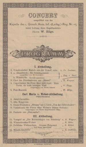 Werke — Fest-Mazurek (Orch.), aufgef. lt. Programm am 26. Dez. 1886 in Darmstadt (s. Abb.); verschollen <> Frei ist der Bursch. Ein politi-, religi- und steuerfreier, aber echt reichstreu und gut bayrischbiergesinnter Studenten-Marsch für die gesamte akademische Jugend, so weit die deutsche Zunge klingt (Kl. bzw. Orch.), Darmstadt: Selbstverlag (L. Schutter) 1895 bzw. 1900; D-Cl <> Eleonoren-Walzer (Orch.), aufgeführt von der Regimentskapelle unter Hilges Leitung am 2. Febr. 1905 bei der Galatafel anlässlich der Vermählung von Großherzog Ernst Ludwig mit Prinzessin Eleonore von Solms-Hohensolms-Lich <> Bearbeitungen von Märschen für Militärmusik, u. a. von Ludwig André bzw. Johann Schrammel (Offenbach: André [1890]), Adolf Kugler (Opel-Marsch zum 50.000. Fahrrad; Mainz: Kittlitz-Schott [1897]) und Eugen von Buri (Giessener Teutonen-Marsch, Mainz: Schott [ca. 1900])