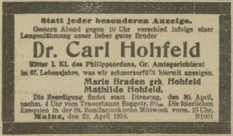 Abbildung 2: Sterbeanzeige, Frankfurter Zeitung und Handelsblatt 30. Apr. 1918