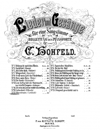 Werke (Zusammenstellung auf Basis von Vorarbeiten von Kristina Krämer) — größere Vokalwerke: Waldmorgen (Mch., „Es ist so still die Maiennacht“), Mainz: Kittlitz-Schott & Bieger, [1884?] u. [1895], Auff. Mainz 17. Nov. 1883 u. 10. Aug. 1884, Leitung: Fritz Steinbach <> Morgenfeier (Doppel-Mch. mit Soloquartett, „Von duft’ger Höhe fliesset“), Mainz, Kittlitz-Schott [1884] <> Kerkerscene aus Goethes „Faust“ (Soli, Kl., Org.), Auff. Mainz 21. Febr. 1884 (Abendunterhaltung im Schumacher’schen Conservatorium) <> Stolzenfels (Mch. mit Knabenstimmen, „Leis in Morgenschweigen“), Mainz: Kittlitz-Schott & Bieger 1894 <> Stabat Mater (Soli, Chor, Orch.), UA Mainz 16. Mai 1896, Leitung: Fritz Volbach <> Berceuse (S, Orch.), Mainz: Schott, Auff. Wiesbaden 8. Jan. 1897 <> Männerchöre (O, lichte Glut, Altes Rheingold, Wie ist die Welt doch schön), Leipzig u. Zürich: Gebr. Hug [1908]; CH-BEl, D-B <> Vater Unser (gem. Chor, S-Solo, Solo-Quartett, Knabench., Orch., Org., Sprecher); Auff. (UA?) Christuskirche Mainz 1917 (Kölnische Zeitung 2. Apr. 1917) <> 137. Psalm (S., Orch.), Auff. postum Lüdenscheid 5. Sept. 1919, ungedruckt <> Lieder und Gesänge: Zwei leichte Duette (S, A, Kl., Frühlingsahnung, „Wenn ich ein Vöglein wär’“), Mainz: Kittlitz-Schott & Bieger [1895]; D-MZsch <> Lieder (Sst., Kl.): Album, 24 Lieder und Gesänge, Mainz: Kittlitz-Schott & Bieger [1884] – daraus [14] Beliebte Lieder, Mainz: Breckheimer, 1893 – Album, Neuauflage Mainz: Kittlitz-Schott [1895], D-Cl, D-MZsch – Neuausgabe, auf 31 Lieder erweitert als Lieder für eine Singstimme mit Begleitung des Klaviers, Mainz: Ebling 1910. – Alle Lieder erschienen auch als Einzeldrucke, teils auch verlegt bei Gebr. Hug in Leipzig bzw. Zürich: 1. Sehnsucht nach dem Rhein; D-Mbs, D-MZsch, 2. Spanisches Ständchen; D-B, D-MZsch, 3. Nachtlied; D-Mbs, D-MZsch, 4. Du bist die Ruh’; D-Mbs, D-MZsch, 5. Ich liebe dich; D-Mbs, D-MZsch, 6. Frühlingslied („Frühling ist da“); D-MZsch, 7. Wiegenlied, Auff. Zürich 1881; D-MZsch, 8. Wenn der Frühling auf die Berge steigt, 9. O wär’ mein Lieb der Fliederbusch, 10. Mein Lieb ist eine rote Ros’, 10a. ([1890] und in der Ausgabe 1893) Chanson de Jung Werner aus Der Trompeter von Säckingen von Joseph Victor von Scheffel; D-B, 11. Herz, mein Herz, 12. Frühlingslied („Neuer Frühling ist gekommen“), 13. Die Nacht; D-MZsch, 14. Ständchen, 15. Lind duftig hält die Maiennacht; D-MZsch, 16. Lieb Vögelein, 17. Blühender Schleh’, 1895 ersetzt durch: Geistliches Lied („Wo du hingehst“); D-MZsch; Einzeldruck auch als Nr. 33, [1896], 18. Ich weiß ein Lied von wundersüßem Klang; D-Mbs, D-MZsch, 19. Leb’ wohl; D-MZsch, 20. Liebeslied; D-Mbs, D-MZsch, 21. Singend geschieht mir’s; D-Mbs, D-MZsch, 22. Maientraum; D-Mbs, D-MZsch, 23. Trauungsgesang; D-MZsch, 24. Frühling bzw. Frühlingslied („Es schmilzt der Schnee“); D-Mbs, 25. Schlaf’, Kindchen, schlaf’; D-Mbs, D-MZsch, 26. Vergißmeinnicht; D-MZsch, 27. Verlornes Glück; D-MZsch, 28. Frühlingslied („In dem Walde sprießt und grünt es“); D-Mbs, 29. Ich will meine Seele tauchen, 30. Engelwacht, 31. Es war ein fauler Schäfer; D-MZsch – dazu erschienen in Übersetzung: Cradle Song (= 7.), Milwaukee: Rohlfing; Petit oiseau (= 16.), Mainz: Schott, D-B; Sérénade espagnole (= 2.), Mainz: Schott, D-B – einige Lieder sind „Herrn Opernsänger Gustav Memmler freundschaftlichst gewidmet“ <> Lieder und Gesänge (Sst., Kl.; Liebeswunsch, Die Heide blüht, Mädchenlied, Duett Singend über die Heide), Leipzig bzw. Zürich: Gebr. Hug [1908]; D-B <> Instrumentalwerke: Suite (Streichorch.), Auff. (UA?) Mainz 1887, daraus: Fuge u. Adagio cantabile, Auff. Lüdenscheid 13. Okt. 1923, als „noch ungedruckt“ genannt (Lüdenscheider Zeitung 16. Ok. 1923) <> Albumblatt (Kl.), Mainz: Kittlitz-Schott [1888], aus einer nicht näher bekannten Suite Nr. 1; D-MZsch <> Menuett (Orch.), Auff. Mainz 1899 (Dirigent: Emil Steinbach) <> Hohfeld soll auch „auf dem Gebiete der Kammermusik Bedeutendes geleistet“ haben (Die Sängerhalle. Allgemeine Deutsche Gesangvereinszeitung 22. Nov. 1894, S. 520)