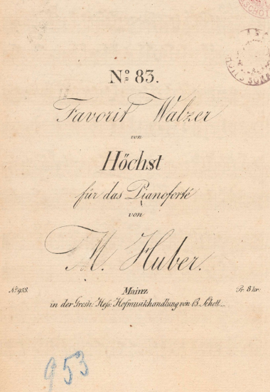 WerkeZuschreibung nicht gesichert: Zwölff Waltzer (Kl.), Mainz: Schott [1802]; ehem. D-B <> Sechs Lieder (Sst., Kl.), ebd. [1802]; s. RISM H 7594 <> Walzer ([Kl.?]), 2. Partie, ebd. [1802] <> 12 Walzer (Orch.), ebd. [1803] <> 6 Walzer & 6 Anglaise (Orch.), ebd. [1804] <> Acht deutsche Lieder (Sst., Kl.), ebd. [1804]; s. RISM HH 7594a <> Six Valses (Kl.), ebd. [1812]; D-Mbs (digital) <> Favorit Walzer von Höchst (Kl.) (= Favoritwalzer Nr. 83), ebd. [1817]; CH-Zz, D-Mbs (digital) <> Außerdem ist es nicht auszuschließen, dass die [1798] im Verlag von Johann Gottlieb Pech unter dem Namen Huber publizierten Hefte 12 Allemandes op. 1, 6 Menuetts und 6 Anglaises op. 2 (sämtl. Kl. und sämtl. verschollen) von ihm stammen