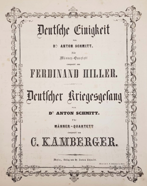 Werke — Bouquets de Mélodies pour les jeunes Guitaristes, Liv. 1 (kein weiteres Heft nachweisbar), Mainz: Appiano [1852] <> Phantasie (Vc., Git.); vgl. Mainzer Anzeiger 15. Juli 1856 <> Deutscher Kriegsgesang (4 Mst.), als Teil einer Doppelausgabe mit Ferdinand Hillers Deutsche Einigkeit, Mainz: Anton Schmitt (Druck: Hickethier) [ca. 1859–67]; D-Hbierwisch (s. Abb.), D-MZs <> Hessische Volkshymne (4 Mst.), als Teil einer Doppelausgabe mit Ludwig Jeschkos Deutsche Volkshymne, ebd. [ca. 1859–67]; D-MZs – dass. als Einzelausgabe (Sst., Kl. bzw. 4 Mst.), ebd.; D-MZs <> Der Patriot (4 Mst.), als Teil einer Doppelausgabe mit Friedrich Lux’ Vaterlandslied, ebd. [ca. 1859–67]; D-MZs