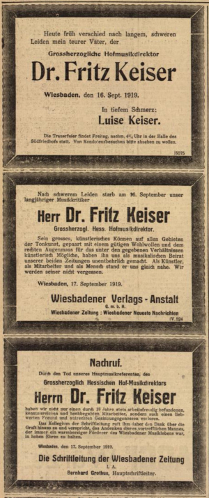 Quellen und Referenzwerke — Standesamtsregister Wiesbaden <> Adressbücher Darmstadt, Kassel, Wiesbaden <> Fallakte Keiser; D-DSsa (Best. G 55 Nr. 140/4) <> „er.“, F. K.’s siebzigster Geburtstag, in: Wiesbadener Zeitung 11. Juli 1918 <> Rigasche Stadtblätter 5. Aug. 1871 <> Rigasche Zeitung 10. Aug. 1871, 30. Jan. 1874 und passim <> Zeitung für Stadt und Land (Riga) 24. Apr. 1874 <> Kölnische Zeitung 14. Mai 1891, 4. März 1901, 19. Sept. 1919 (Todesmeldung) <> Musikalisches Wochenblatt 22. März 1878, 7. Juli 1892 <> Großherzoglich Hessisches Regierungsblatt 18. Juli 1892 (Beilage 19) <> Neue Zürcher Zeitung 14. Dez. 1895, 18. Jan. 1896; Signale für die musikalische Welt 14. Dez. 1897 <> Wiesbadener Tagblatt 20. Mai 1902, 18. Sept. 1919 (Todesanzeige) und passim <> Wiesbadener Neueste Nachrichten 31. Jan. 1914, 20. Sept. 1919 (Bericht über die Trauerfeier) und passim <> Wiesbadener Zeitung 29. Aug. 1918, 18. Sept. 1919 (Todesanzeigen) <> freundliche Hinweise von Herrn Dr. Peter Engels, Stadtarchiv Darmstadt