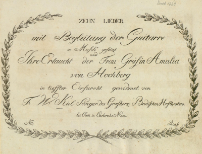Werke — 1) gedruckt (zur hs. Überlieferung einzelner Stücke daraus siehe RISMonline): IV Lieder (Sst., Kl.; 1. Romanze, 2. Der Traum im Wiesenthale, 3. Beruhigung, 4. Mein Liebchen), Mainz: Schott [1810]; D-B, D-Mbs (digital) <> Zehn Lieder (Sst., Git.; 1. „Siehst du nicht auf jenem Hügel“, 2. Der Hirtin Nachtlied, 3. Adeleide, 4. Die Alpen, 5. An die Rose, 6. Klage, 7. Beruhigung [wie oben], 8. Mein Liebchen [anders als oben], 9. Erinnerung, 10. Aria aus der Schweizerfamilie von Weigl) (Widmung an Gräfin Amalia von Hochberg), Karlsruhe: Orth [1811]; D-KA (digital), D-Mbs