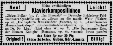Zugegebenermaßen ließ sich bislang nur ein vager Berührungspunkt Otto Kleins mit dem mittelrheinischen Gebiet ausmachen: 1889 erschien (lt. MMB) eine Titelauflage seines Opus Acht im Selbstverlag in Frankfurt/M. und es ist demnach nicht auszuschließen, dass er sich dort einige Zeit aufgehalten haben könnte, auch wenn angesichts seiner weiteren Stationen die Vermutung naheliegt, dass es sich um einen Druckfehler handelte und eigentlich Frankfurt/O. gemeint sein dürfte. Dennoch: angesichts seines Œuvres, das nicht zuletzt zum Vergnügen der Botaniker (genauer der „Herren [und Damen!] Gärtnern und Gartenliebhabern“, wie es in einer Anzeige seines op. 8 heißt (Der praktische Ratgeber im Obst- und Gartenbau 20. März 1887)) und Katzenliebhaber*innen unter unserer Leserschaft der Erinnerung verdient, soll auch er einen kleinen Platz im MMM bekommen.