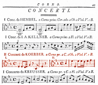 Abbildung: Incipits zweier Hornkonzerte Körbers (rot eingefärbt; neben einem von Georg Anton →Kreusser) in Breitkopfs Verkaufskatalog, S. 43