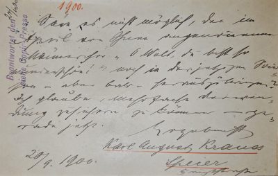 Abbildung 2: An André gerichtete Briefkarte (Speyer 20. Sept. 1900) mit der Bitte, den „Männerchor ‚O Welt du bist so wunderschön!‘ noch in dieser Saison – aber bald – herauszubringen“; D-OF