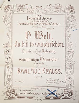O Welt, du bist so wunderschön (4st. Mch.; „Nun bricht aus allen Zweigen“; der Liedertafel Speyer und ihrem Dirigenten Richard Schefter gewidmet) op. 17, Offenbach: André [1901]; D-B, D-OF (Herstellungsunterlagen) <>