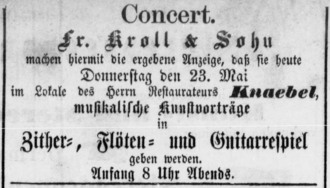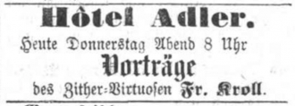 (2) Friedrich Kroll jun. erhielt von seinem Vater zweifellos eine vielseitige, wenn auch bodenständige instrumentale Ausbildung (vor allem Violine, Flöte und Gitarre), wandte sich aber insbesondere dem Zitherspiel zu. Den oben erwähnten gemeinsamen Auftritten folgten Konzerte, die der junge Musiker seit 1864 als Zither-Virtuose in Bitburg und Umgebung (etwa Kyllburg) wie auch in weiterem Umkreis (1864 Cochem, seit 1866 mehrfach in Aachen) gab. Dass er im März 1866 verlauten ließ, sich bereits „vor sämmtlichen Höfen Europa’s“ produziert zu haben, scheint zumindest etwas übertrieben zu sein; längere Aufenthalte als „Hofcitherspieler und Citherlehrer Ihrer Majestät der Königin von Belgien“ (Marie Henriette) (Zweibrücker Wochenblatt 14. Apr. 1867) in den Jahren 1866 bis 1868 sind dagegen anzunehmen, wenn auch noch nicht im Einzelnen belegt. In der Zwischenzeit bzw. ab 1868 versuchte Kroll ohne nachhaltigen Erfolg, sich als Musiklehrer u. a. in Aachen bzw. Bitburg niederzulassen; außerdem trat er seit 1866 mit seinem Bruder Ludwig mehrfach gemeinsam auf, so 1871 in Luxemburg (Stadt) und Zweibrücken, bevor er wiederum als Solist Konzerte in Neuss und Zweibrücken gab (Sept. 1871 und Mai 1872). Ludwig Kroll (* Saarlouis 11. Mai 1849 | † Chicago war 22. Apr. 1886) war im Mai 1872 nach Nordamerika ausgewandert und konnte sich in Chicago als „music teacher“ etablieren; vielleicht hatte er den älteren Bruder ermutigt, ebenfalls sein Glück in der Neuen Welt zu suchen – jedenfalls folgte Friedrich im Mai 1873 nach, und es gelang ihm immerhin, auf einer „Concert-Tour durch die kleinen Städte Wisconsin’s Furore“ zu machen (Der Deutsche Correspondent (Baltimore) 24. Nov. 1874), bevor er nach vierwöchiger Krankheit starb. Dass die Bewohner des Städtchens Stevens Point ihn nicht nur „feierlich bestatten“ ließen, sondern ihm sogar ein Denkmal setzten, spricht für sie. Dagegen hatte sich die traurige Nachricht unter den Zitheristen der Alten Welt offenbar nicht herumgesprochen (Fiedler nannte ihn „verschollen“); vielleicht deshalb, weil seine Werke nach wie vor (und bis in die 1890er Jahre hinein) geschätzt wurden, hielt man ihn für lebendig und berichtete beispielsweise 1891 sehr anschaulich von allabendlichen Konzerten Krolls in Lyon (Zither-Signale Apr. 1891, S. 59) – zweifellos bestenfalls ein Missverständnis. Dass Peter Eduard Hoenes in Trier zu Beginn des Jahres 1863 seine Verlagsproduktion mit Werken des damals noch nicht Sechzehnjährigen Friedrich Kroll in bemerkenswert planmäßiger Weise begann, ist eine überraschende Tatsache, wobei man vielleicht zu Recht argwöhnen mag, dass das eine oder andere Stück aus der Feder von Friedrich Kroll senior stammt oder auf ihn zurückgeht. Dem staunenswerten Können des Instrumentalisten – 1867 sagte man ihm nach, er spielte „z. B. die schwerste Klaviermusik, als: Sonaten von Mozart, Beethoven, Kuhlau [etc.], Ouverturen [etc.] vollständig auf der Cither“ – steht im übrigen die Gediegenheit seiner „vielen Citherspielern bekannt[en]“ Kompositionen gegenüber (Zweibrücker Wochenblatt 14. Apr. 1867).