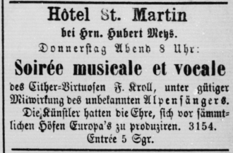 (1) Als Hautboist des 36. Füsilier-Regiments war Friedrich Kroll (sen.) in den Jahren 1847–1849 in Saarlouis stationiert; zwischen 1852 und 1861 ist er als (ziviler) Musiklehrer im luxemburgischen Grevenmacher nachweisbar, von wo er anschließend mit seiner Familie nach Bitburg zog. Zumindest zeitweilig leitete er hier den Musik-Verein, und sicherlich erteilte er weiterhin Musikunterricht; seit 1861 ließ sich Kroll in der Stadt selbst, aber auch in der Umgebung bei unterschiedlichen Gelegenheiten (zumeist in Wirtshäusern, bei Kirchweihfesten etc.) mit seinem Sohn Friedrich (2), ab 1864 auch gemeinsam mit dessen um zwei Jahre jüngeren Bruder Ludwig (s. u.) in Triobesetzung hören, wobei das Publikum sich auf „musikalische Kunstvorträge in Zither-, Flöten- und Guitarrespiel“ freuen konnte (Allgemeiner Anzeiger 23. Mai 1861; s. Abb. 1). Im Februar 1847 schloss Kroll in Saarlouis die Ehe mit Anna Maria geb. Schleich (* ca. 1826), einer Tochter eines dort ansässigen Hausmanns – sie starb 1874 in Bitburg als „vidua acatholici musici“, der bereits am 20. August 1866 im Sterbeeintrag einer Tochter als verstorben bezeichnet wird.