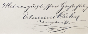 Auch Aktivitäten mit überregionaler Reichweite sind belegt: Einem dem Badischen Großherzog gewidmeten und im Januar 1899 in Karlsruhe unter Kühns Leitung uraufgeführten Chorwerk standen die Operetten gegenüber, mit denen er beim Berliner Central-Theater Fuß zu fassen hoffte (Brief an André, Speyer 26. Juni 1901), wobei die zu diesem Zweck nach Berlin unternommenen Reisen nicht das gewünschte Resultat erbrachten. Auch seine Beteiligung am Deutschen Sängerfest in New York im Juni 1900, wo immerhin einer seiner Männerchöre einen Achtungserfolg erzielen konnte, fand ihren Niederschlag lediglich in einer Zeitungsmeldung – man fragt sich, ob der hymnische Tonfall, den die Lokalpresse hierbei erneut an den Tag legte („der in hiesiger Stadt bestbekannte und von der musikliebenden und musikverständigen Bevölkerung hochgeschätzte Komponist Edmund Kühn […] hat sich mit den besten Tonkünstlern gemessen und den Wettkampf mit Ehren bestanden“; Speierer Zeitung 20. Juni 1900), seinen Zweck nicht eher verfehlte.