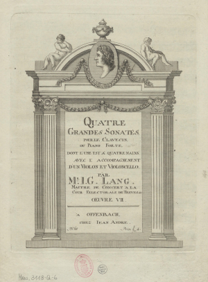 Johann Georg Lang blieb unverheiratet. Die sich vielleicht aufdrängende Annahme, das lorbeerbekränzte Haupt auf dem Titel der Quatre Grandes Sonates (1782; s. Abb. 2) stelle den Komponisten dar, mag reizvoll sein, ist aber abwegig: Es wäre nicht nur das einzige auf diese Weise überlieferte Musikerportrait jener Zeit, sondern die Züge widersprechen auch in sehr deutlicher Weise dem zweifellos authentischen Schattenriss Boßlers (s. Abb. 1). In Wahrheit haben wir eines von vielen ikonographischen Versatzstücken vor uns, von denen die Musikverlage gerade in dieser Zeit gern Gebrauch machten und die man nicht allzu wörtlich nehmen darf: Das Profilbild eines „gekrönten Dichters“ (Poeta laureatus) symbolisiert lediglich menschliche Schöpferkraft.