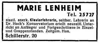 Marie Lenheim, eine Tochter des aus Fulda stammenden jüdischen Kaufmanns Salomon L. (1830–1919), durchlief ihre gesamte musikalische Ausbildung am Hoch’schen Konservatorium in Frankfurt: Etwa von ihrem achten bis zehnten Lebensjahr besuchte sie zunächst die dortige Seminarschule und anschließend bis zu ihrem sechzehnten Lebensjahr die Vorschule. 1906/07 nahm sie das Studium an der Hochschule auf und studierte bis 1915/16 Klavier bei Ernst Engesser, Kontrapunkt bei Iwan Knorr und Bernhard Sekles, bei letzterem auch Komposition, sowie ein Semester Gesang bei Carl Rehfuß und deutlich später zwei Semester Partiturspiel bei Carl Breidenstein. Nachdem sie 1910 und 1914 die Methodik-Prüfungen ersten und zweiten Grades bestanden hatte, erteilte Lenheim seit 1916/17 Klavierunterricht an der Vorschule. Daneben ist sie seit 1914 als Klavierbegleiterin und Pianistin bei etlichen Konzerten in Frankfurt und Umgebung nachweisbar – insbesondere bei Volkskunstabenden und anderen Veranstaltungen des Ausschusses für Volksvorlesungen. Im Frühjahr 1933 wurde Lenheim aufgrund ihrer jüdischen Abstammung am Konservatorium gekündigt, woraufhin sie unter der Rubrik „Freie Kräfte“ – neben ihren ebenfalls entlassenen Kolleg*innen Aenni Rosenthal, Willy Salomon und Toni Oberdorfer – als „staatlich anerkannte Klavierlehrerin“ im Frankfurter Israelitischen Gemeindeblatt inserierte (Nr. 9 (Mai) 1933; s. Abb.). Einer späteren Anzeige zufolge erteilte sie außerdem Gehörbildungs- und Blockflötenunterricht. Noch bis einschließlich 1937 lassen sich einige Auftritte belegen – bei Künstlerabenden der Zionistischen Vereinigung sowie bei Konzerten der jüdischen Tonkünstler Frankfurts. Auch veranstaltete sie gemeinsam mit anderen jüdischen Musiklehrer*innen Schülerabende. Um 1938/39 emigrierte sie nach Großbritannien, wo ihr Bruder Ludwig (1882–1951) bereits 1913 geheiratet hatte und seither lebte. 1939 wohnte Marie Lenheim in Loddon (Norfolk); im November 1947 wurde sie, in der Nähe von Shrewsbury (Shropshire) wohnend, eingebürgert. Ihr weiterer Lebensweg ist ungewiss. Ihre Schwester Ernestine verh. Keller (1878–1943) wurde in Auschwitz ermordet.