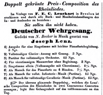 Werke — Die meisten Kompositionen Joseph Lenz’ blieben ungedruckt und sind verschollen. Dies gilt für die „größeren und kleineren“ Werke, die er während der 1830er Jahre mit seinen Koblenzer Chören aufführte (Bericht des Direktoriums 1847), ebenso wie für die „mehrfachen Instrumental- und Vocal-Compositionen“, die ihm in Breslau bei den Konzerten mit dem Akademischen Musikverein den „ungetheiltesten Beifall der Kenner und des Publikums“ einbrachten (ebd.), darunter zwei Ouverturen (Christoph Columbus sowie eine Fest-Ouverture; s. AmZ 29. Mai 1839 und 20. Mai 1840). Ein Stabat mater (Mch., Solostimmen, Str.-Orch.) aus dem Zeitraum 1842–1847 verschwand bereits kurz nach der Aufführung in der Koblenzer Liebfrauenkirche (Nekrolog). Lediglich der Deutsche Wehrgesang („Sie sollen ihn nicht haben, den freien deutschen Rhein“) erschien (als Klavierlied, für Männerchor, in Fassungen Militärorchester, für Klavier zu zwei bzw. vier Händen) im Druck, und zwar 1841 bei Leuckart in Breslau; D-B, F-Pn (Sst., Kl.) <> Schrift: [Joseph] Lenz, Zeugniß, betreffend ein von Hrn. H. J. Haseneier, Instrumentenmacher in Coblenz, neu erfundenes Blase-Baßinstrument, genannt Contra-Bassophon, in: NZfM 12. Apr. 1850, S. 154–155