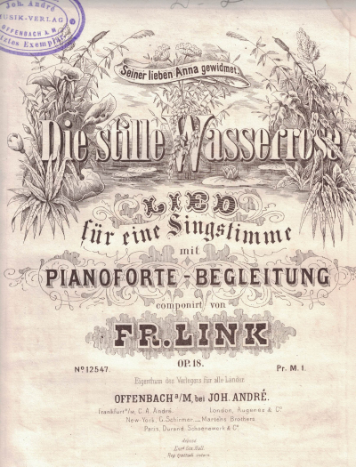 Werke — Morceau de Salon (Kl.) op. 1, Offenbach: André [1860]; D-OF (autographe Stichvorlage) <> Nachtgesang. Tonstück (Kl.) op. 2, Frankfurt: Henkel [1863] <> Erinnerung. Notturno (Kl.) op. 3, ebd. [1863] <> Der Sennerin Abschied von der Alm. Schweizer Idylle (Kl.) op. 4, ebd. [1864] <> Mazourka brillante (Kl.) op. 5, ebd. [1865] <> Zwei leichte Solos (Kl., Vc./Vl.) op. 6, ebd. [1865]; D-Dl – NA (hrsg. von Edmund Parlow) Frankfurt: Stamm 1913; D-B <> In der Abendstille (Kl.) op. 8, ebd. [1871] <> Romanze (Kl.) op. 9, Leipzig: Kahnt [1875]; D-B <> Drei Lieder (Sst., Kl.) op. 11, Zürich: Hug [1874]; CH-Zz <> Zwei Lieder (Sst., Kl.) op. 12, ebd. [1874] <> Drei Lieder (Sst., Kl.) op. 13, ebd. [1874] <> Drei Fugen (Org.) op. 14, Offenbach: André [1877]; D-OF, GB-Lbl – NA Wiesbaden: Lenz 2001 <> Achtzehn kurze und leichte Präludien (Org.) op. 15, ebd. [1877]; D-OF <> Zwölf kurze und leichte Präludien (Org.) op. 16, ebd. [1877]; D-OF <> Hurrah, Germania (Festgabe zur Enthüllungsfeier des Niederwalddenkmals; 4st. Mch.) op. 17, ebd. [1877]; D-OF <> Die stille Wasserrose (Sst., Kl.; seiner Ehefrau Anna gewidmet) op. 18, ebd. [1877]; D-B, D-OF (s. Abb.) <> Ein im Nekrolog erwähntes Klaviertrio blieb ungedruckt und ist verschollen.