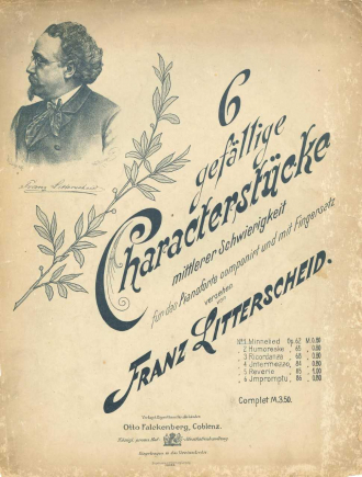 Abbildung: Titel einer 1897 erschienenen Sammelausgabe mehrerer bei Falckenberg veröffentlichter Klavierwerke Litterscheids mit Portrait des Komponisten; D-Kbeer
