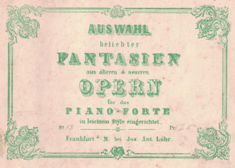 Daneben erschien seit ca. 1832 eine umfangreiche Ausgabe der Klavierwerke Mozarts sowie seit 1834 eine Neue correcte Ausgabe der Klaviersonaten Beethovens und, ebenfalls als Reihe konzipiert, Gewählte Tonstücke für Klavier von Haydn. Ebenfalls in den frühen 1830er Jahren publizierte Löhr eine Reihe Operas de W. A. Mozart arrangés sans paroles pour Piano-Forte (Abb. 2; D-Kbeer). Insgesamt umfasst das Verlagsprogramm Löhrs weit über 900 Nummern.