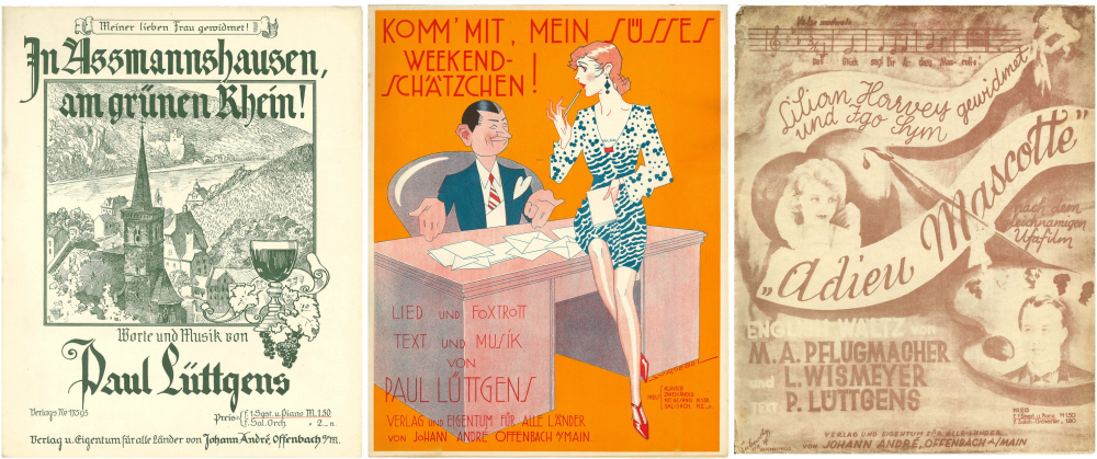 Es ist immer eine Frage der Sichtweise – man mag es bedauern, dass Paul Lüttgens nur wenige Spuren hinterlassen hat, oder auch nicht. Jedenfalls begegnet er uns seit der Mitte der 1920er Jahre als Kaufmann in Frankfurt (zwischenzeitlich auch in Offenbach), der später aufgrund seiner Eigenschaft als „jederzeit vorbildlicher Nationalsozialist“ 1939 zum Gauhauptstellenleiter des Frankfurter Bauamts avancierte und „seit der Machtübernahme an der Aufbauarbeit in der nationalsozialistischen Wirtschaftsführung […] im nimmermüden Einsatz an hervorragender Stelle“ – d. h. in einer ganzen Reihe von Aufsichtsräten – mitwirkte (Frankfurter Zeitung und Handelsblatt 6. Nov. 1940). Und er begegnet uns auch (noch vor 1933) als Hobbykomponist, der mit seinen beiden selbstgetexteten Schlager-Liedern – jetzt einmal gleichgültig, welche Keule man aus heutiger Sicht gegen sie schwingen mag – Facetten des Lebensgefühls am Ende der „Goldenen Zwanziger“ repräsentiert, wie man sie in ihrer Gegensätzlichkeit ansonsten kaum wahrnimmt. Erwähnt sei noch, dass Lüttgens spätestens seit 1929 in Beziehung stand zu dem Innsbrucker Kapellmeister Max Pflugmacher, in dem wir vielleicht seinen musikalischen Mentor sehen dürfen – dessen ideologiekonforme Oper Prinz Eugen war 1934 in Frankfurt über die Bühne gegangen.