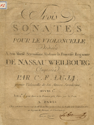 (3) Nach dem Besuch des Gymnasiums in Weilburg schrieb sich Carl Friedrich Luja im Mai 1782 an der Leipziger Universität ein (Theologie, Philosophie), brach aber 1784 zugunsten einer Studienreise, die ihn nach Süddeutschland, in die Schweiz und nach Frankreich führte, die akademische Ausbildung ab. Begegnungen mit Joseph Aloys Schmittbaur in Karlsruhe und Ignaz Fränzl in Mannheim erwähnt Strieder; ein Aufenthalt in Paris ist dukumentiert durch die Veröffentlichung seines Opus 1 (1785), dessen Titelseite zudem den einzigen Beleg für eine (kurzzeitige) Anstellung als Cellist in der Hofkapelle der Widmungsträgerin Fürstin Caroline von Nassau-Weilburg in Kirchheimbolanden darstellt (s. Abb.). In Paris mag Luja auch mit der Familie Romberg, die zur selben Zeit in den Concerts spirituels auftrat, in Kontakt getreten sein – Andreas Romberg bezeichnete er später als seinen „ancien ami“ (s. Werke); auch soll er (wiederum Strieder zufolge) in der französischen Hauptstadt von Joseph Martin Kraus Kompositionsunterricht erhalten haben. 1787 (im Todesjahr Carolines) nahm Luja seinen endgültigen Wohnsitz in Hanau, wo er als Lehrer an der Evangelisch-lutherischen Lateinschule und als Kantor an der Johanneskirche tätig war; dass er auch das öffentliche Musikleben, etwa als Konzertveranstalter, mitprägte, ist wenigstens für die Jahre 1795–1802 zu belegen. Quellen für seine Ausbildung als Cellist sind bislang nicht bekannt. Lujas Tochter Katharina (1800–1874) war Malerin in Hanau, sein Bruder Johann Christian Reinhard (1767–1847) Pfarrer in Wiesbaden und später in Dotzheim; an ihn erinnert die Luja-Hütte in Dotzheim.