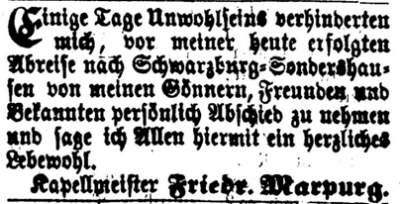 Abbildung: Marpurg verabschiedet sich via Presseinserat von seinen Mainzer „Gönnern, Freunden und Bekannten“; Mainzer Anzeiger 29. Apr. 1864