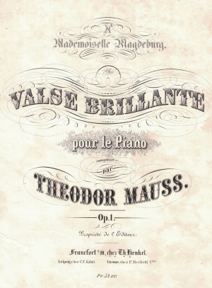 Werke — Die Nachtviole (Sst., Kl.) o. op., Mainz: Schott [1855]; D-Mbs (digital) <> Valse brillante (Kl.) op. 1, Frankfurt: Henkel [1856]; D-Kbeer (s. Abb.) <> Trois Mazourkas op. 2 (Kl.), ebd. [1856] <> Deux Bagatelles (Kl.) o. op., Mainz: Hickethier [1856] <> Trois Rondeaux (Kl.) o. op., Frankfurt: Henkel [1856]; D-F <> Werke mit höheren Opuszahlen erschienen in London; einige von ihnen wurden von André in Offenbach ab ca. 1862 nachgedruckt.
