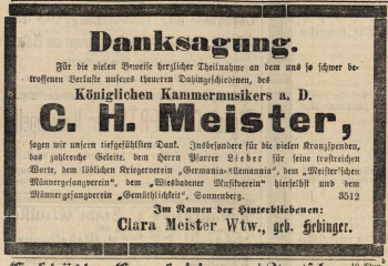 Quellen und Referenzwerke — Standesamtsregister Arolsen und Wiesbaden <> Adressbücher Wiesbaden <> Wiesbadener Bade-Blatt 22. Juli 1890, 20. Febr. 1892, 13. Dez. 1902 (Nekrolog); Wiesbadener General-Anzeiger 1. Juli 1894, 26. Aug. 1894, 28. Sept. 1894, 23. Febr. 1895, 10. Okt. 1897, 8. Febr. 1901, 5. Okt. 1902, 29. Okt. 1902 (private Todesanzeige), 1. Nov. 1901 (Danksagung; s. Abb.); Wiesbadener Tagblatt 7. Dez. 1900, 24. Apr. 1902, 28. Okt. 1902 (Nachruf), 1. Nov. 1902, 29. Mai 1903 (betr. Ferd. Meister in Bad Pyrmont); Frankfurter Musik- und Theaterzeitung 17. Juni 1908; Signale für die musikalische Welt 14. Aug. 1929 (Nachruf Ferd. Meister) <> RiemannL seit 1909 und MüllerDML (zu Ferd. Meister)