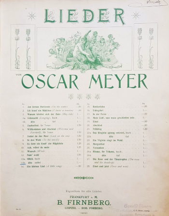 Lieder als Reihe Lieder von Oscar Meyer (Übernahmen der Peters- und Ascherberg-Ausgaben sowie eigene Verlagswerke Firnbergs als Einzelausgaben, zum Teil für verschiedene Stimmlagen): Nr. 1 Am fernen Horizonte (On the water) <> Nr. 2 Ich kenn’ ein Mädchen (I know a maiden) <> Nr. 3 Warum kleidet sich der Hain (May-tide) <> Nr. 4 Sehnsucht (Longing); D-B <> Nr. 5 Zauberlied, [1903]; D-B <> Nr. 6 Willkommen und Abschied (Welcome and Farewell) <> Nr. 7 Siehst du das Meer (Look on the sea) <> Nr. 8 In den Wald (To the woods) <> Nr. 9 Es liebt ein Knab’ ein Mägdelein <> Nr. 10 Ach, wärst du mein; D-B <> Nr. 11 Wunsch (Wish) <> Nr. 12 Fahr’ wohl; D-B <> Nr. 13a–b Glück, [1901]; D-B (hohe Ausg.), D-Hbierwisch (mittlere Ausg., s. Abb. 2), Privatbesitz (IMSLP, hohe Ausg.) <> Nr. 14 Ein kleines Lied (A little song) <> Nr. 15 Bettlerliebe <> Nr. 16 Unbegehrt <> Nr. 17 In der Ferne <> Nr. 18 Mein Lieb’, nun muss geschieden sein <> Nr. 19 Einst <> Nr. 20 Abschied <> Nr. 21 Frühling <> Nr. 22 Das Ringlein sprang entzwei; D-B <> Nr. 23 Ein Vöglein singt im Wald <> Nr. 24 Morgenlied <> Nr. 25 Versunken <> Nr. 26 Hinaus, ihr Träume; D-B <> Nr. 27 Die Rose und der Thautropfen (The rose and the dewdrop); D-B <> Nr. 28 Einst und jetzt (Once and now); D-B <> Nr. 29 Liebesgrüsse, [1903]; D-B <> Nr. 30 Jubelkunde, [1904]; D-B <> Nr. 31a–b Dein, [1904]; D-B (hohe und tiefe Ausg.) <> Nr. 32a–b Vor Sonnenaufgang, [1904]; D-B (hohe und tiefe Ausg.) <> Nr. 33 Nur einmal noch, [1905]; D-B <> Nr. 34 Vergiss, [1913]; D-B <> Das Gewitter: „Urahne, Grossmutter, Mutter und Kind“. Lebensbild (Sst., Kl.), Frankfurt/M: Firnberg sowie Berlin: Bote&Bock [1909]; D-B – dass. (Sst., Orch., obl. Kl., Org.), Berlin: Bote&Bock [1909]; D-B