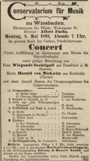 Nach einer Konzerteise nach Russland im Sommer spielte er am 21. Okt. 1893 bei der Uraufführung der Cellosonate op. 27 von Albert Fuchs in Mainz im Konzerthaus der Liedertafel den Klavierpart (Cellist war der Widmungsträger des Werks, Oskar Brückner). Einige weitere Auftritte in Wiesbaden schlossen sich an, etwa am 10. März 1894 in Beteiligung an einem Konzert des Lufer’schen Gesangvereins mit Liedern und Klaviermusik sowie am 26. Apr. 1894 in einem von Albert Fuchs geleiteten Konservatoriumskonzert, in dem Mickwitz Solist in Henry Litolffs Concert-Symphonie (Kl., Orch.) war. An auswärtigen Auftritten sind neben einem Winterkonzert am 15. März 1894 in Stuttgart mit dem dortigen Lehrergesangverein vor allem die beiden Auftritte mit der Wiesbadener Sängerin Ida Goeringer in Karlsruhe (Liederabend, Museumssaal, 19. Nov. 1894) und Mannheim (Matinée, Kasinosaal, 2. Dez. 1894) zu nennen.